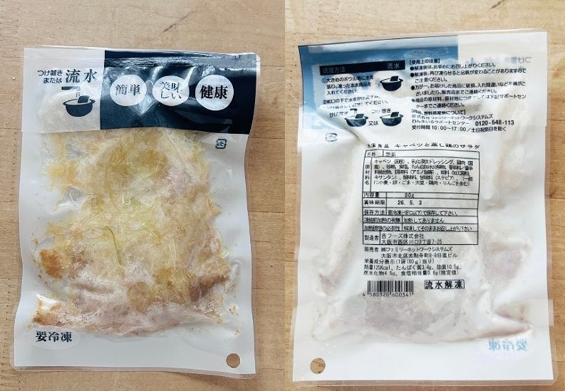 キャベツ(国産)、乳化液状ドレッシング、鶏肉(国産)、砂糖、食塩、たん白加水分解物、香辛料/香辛料抽出物、調味料(アミノ酸等)、糊料(加工澱粉、キタンサン)、酸味料、甘味料(ステビア)、(一部に小麦・卵・ごま・大豆・鶏肉・りんごを含む)